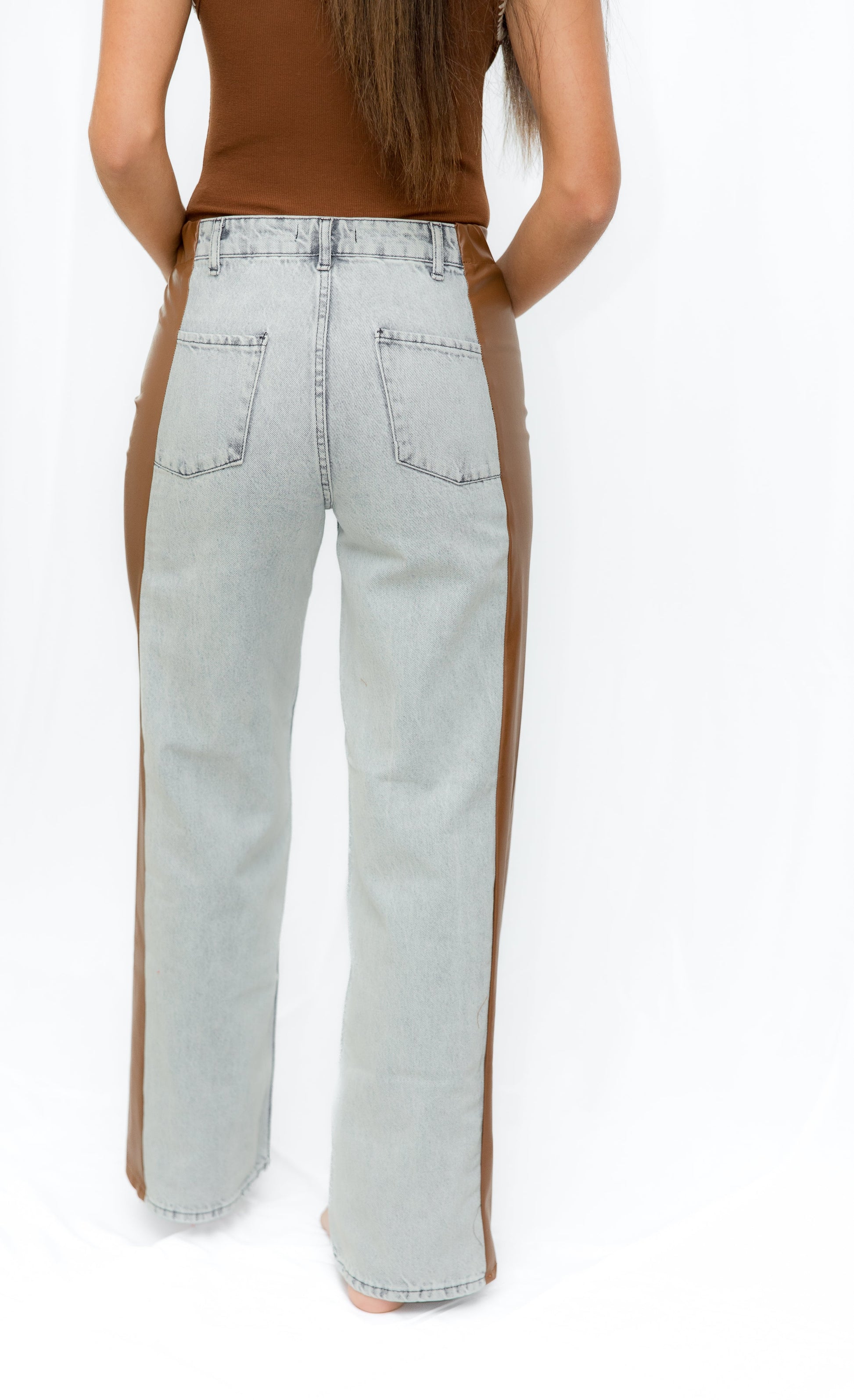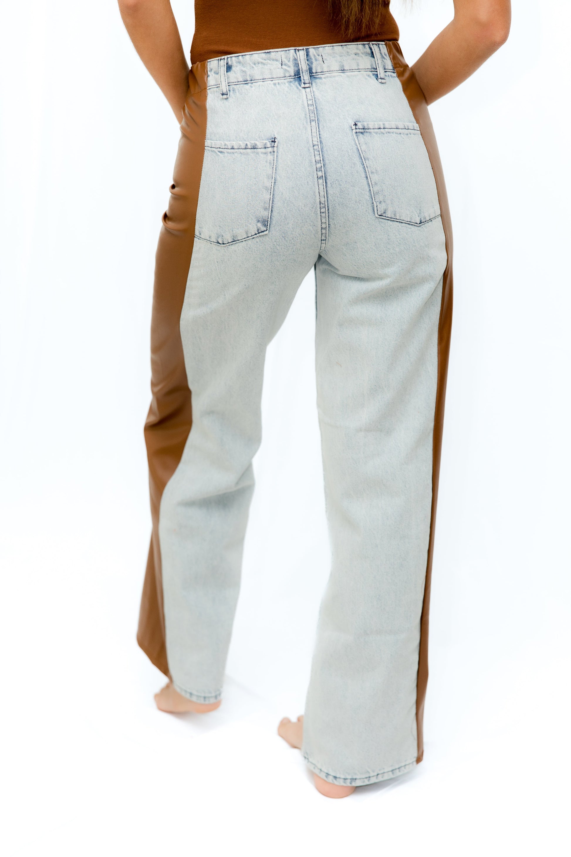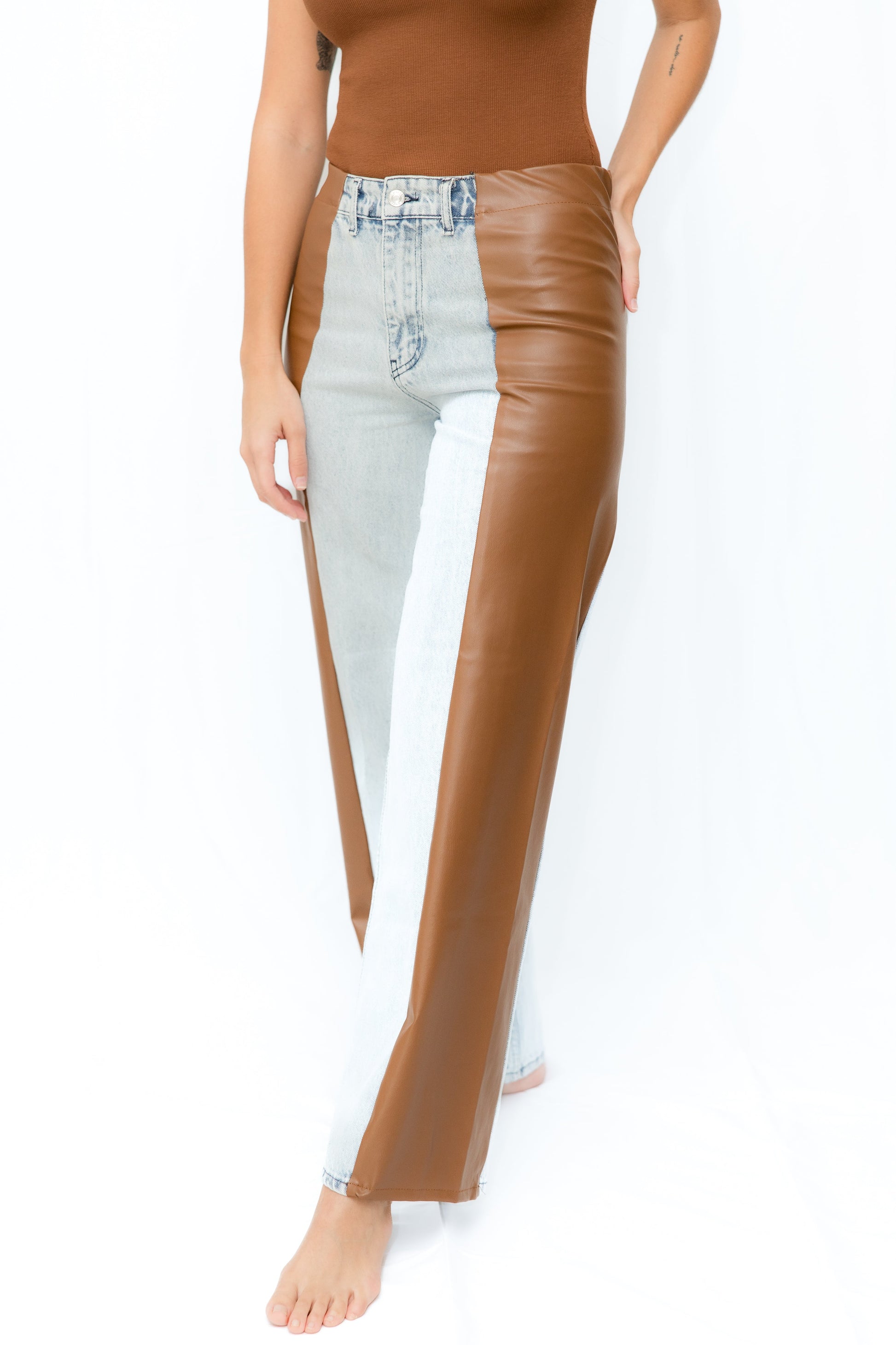 Make a bold statement with these unique two-tone pants, combining sleek leather panels with classic denim. Available in black and brown, they offer an edgy yet sophisticated look that pairs perfectly with any top for day or night styling.